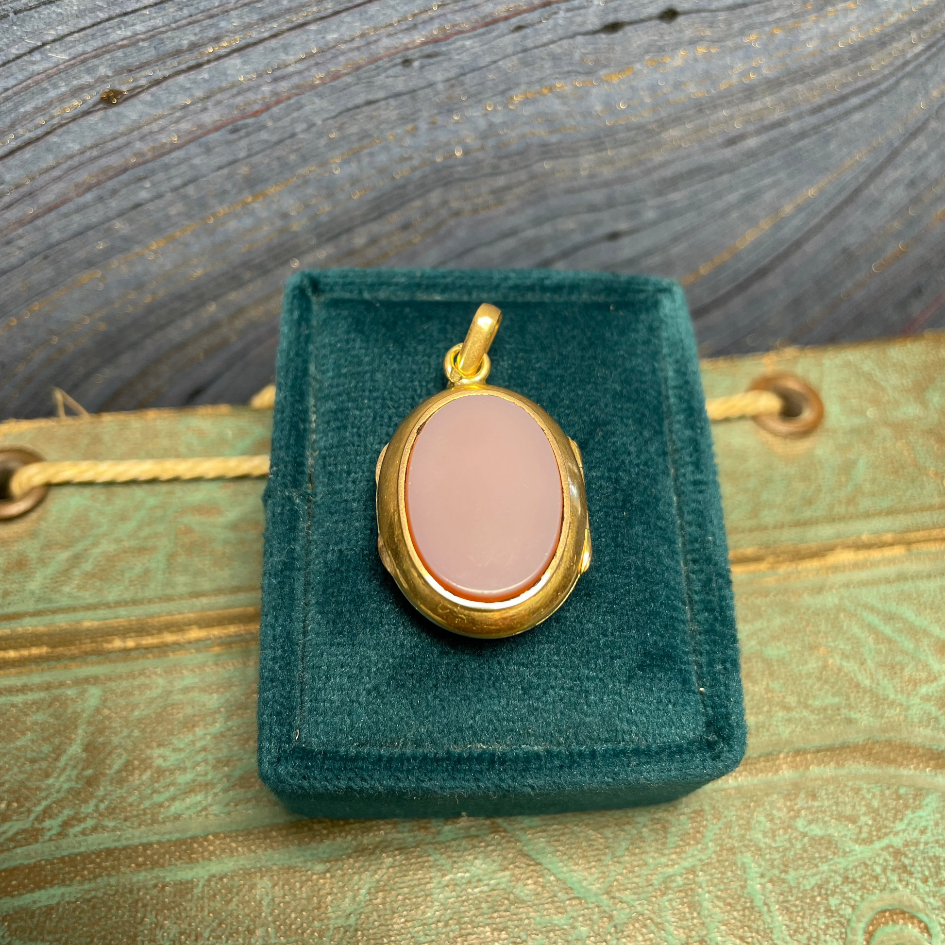 Totally intact and uncarved,18k yellow gold locket with red and white agate on front and back. Interior glass panel is intact. Length> 1.25" including bail. Bail opening - 6.5x3.2mm. Width<3/4". 6.09g. XRF - 18k. Stamped - 2 illegible makers marks/hallmarks. Very vintage/antique.