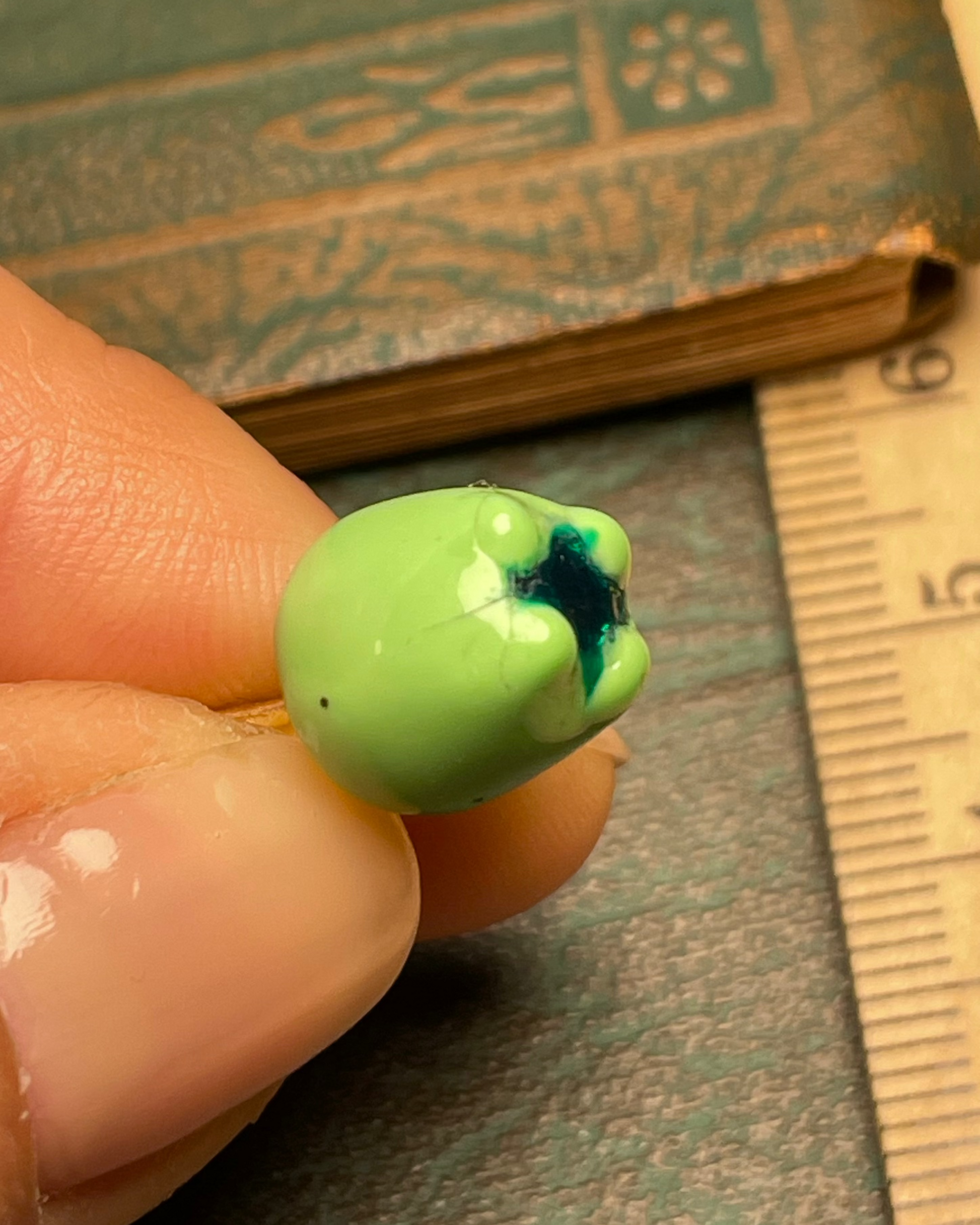You're the green apple of my eye! This 14k yellow gold green enamel apple charm is the cutest! Length - 15/16" including bail. Bail opening - 4.2x3mm. Width -3/8". 3.33 g. XRF - 14.19k. New construction, discount for some very fine hairline cracks in the enamel. Enamel is secure.