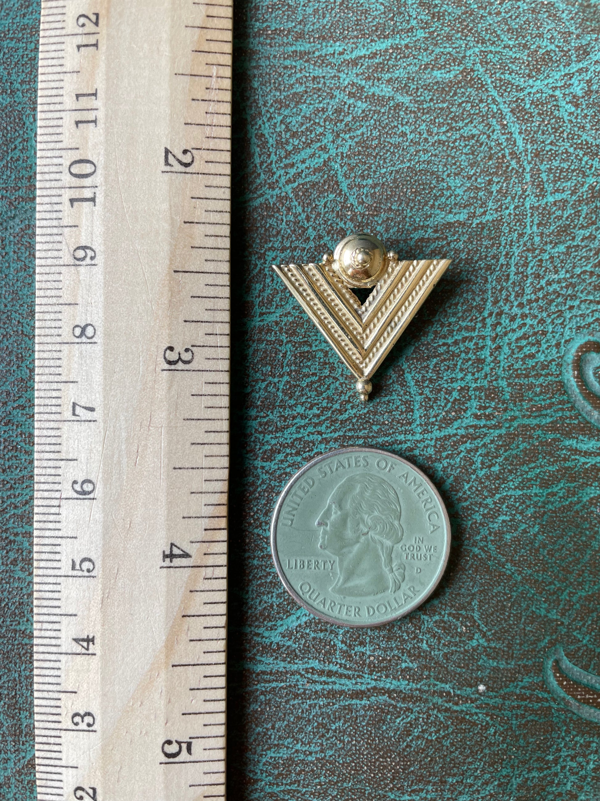 Love this slider...like an Etruscan-ish boob over a V epaulette...hello girl army! 14k yellow gold slider pendant. Length - 7/8". Width - 15/16". Bail Openings - 4x2mm. 3.17g. Stamped - "585 MSS".