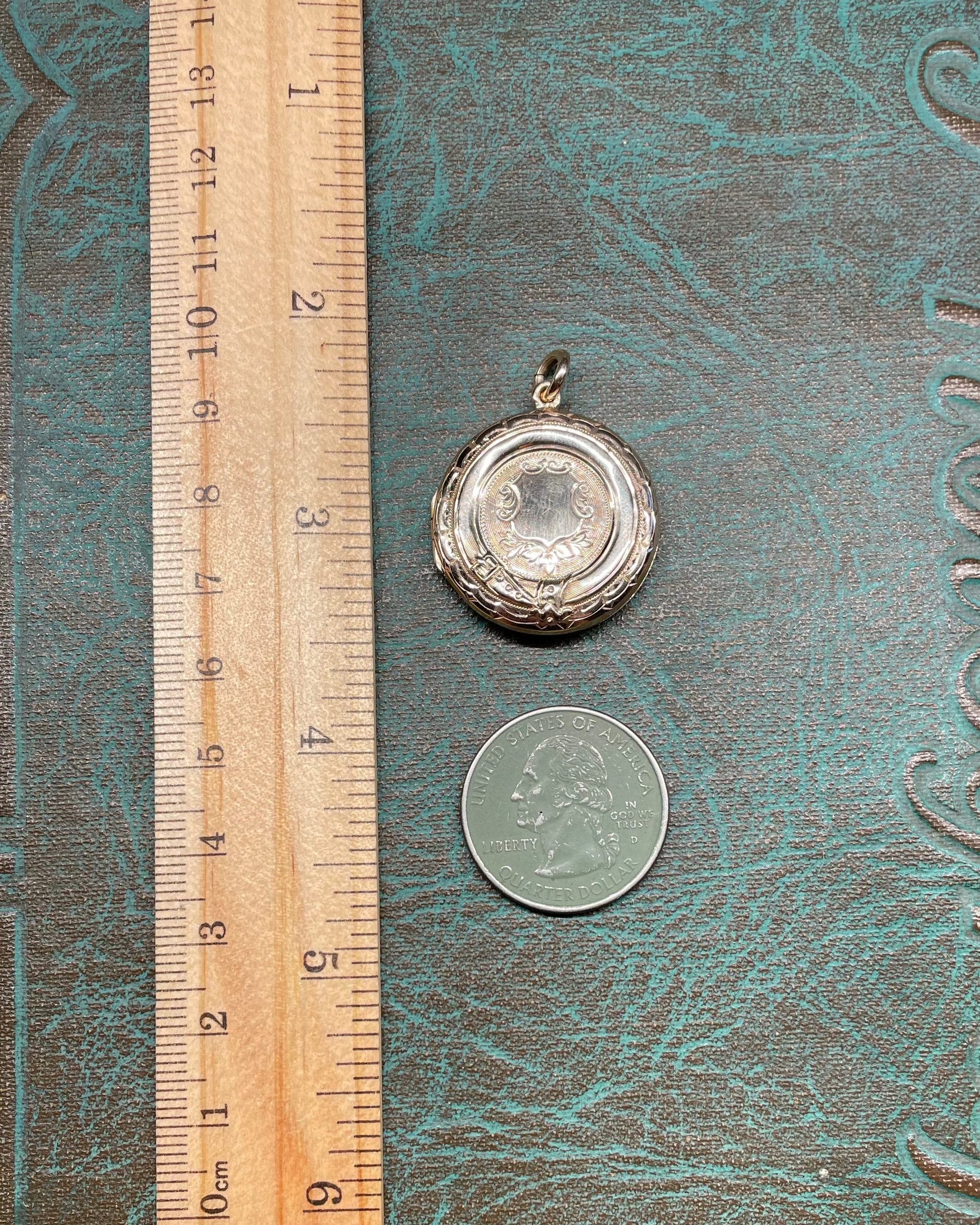 This is a 9k rosy gold locket featuring an engraved shield and belt motif on the front and a floral design on the back. Length - 1.25" including bail. Bail opening - 3.4mm. Width - 1 1/16". XRF - 9k. 5.8g. Stamped: "HM" (Possibly maker: Henry Matthews) "9" "375" "(anchor)" (for Birmingham made) "S" (for 1917/8 or 1942/3, but assume 1917/8). Antique/Vintage.