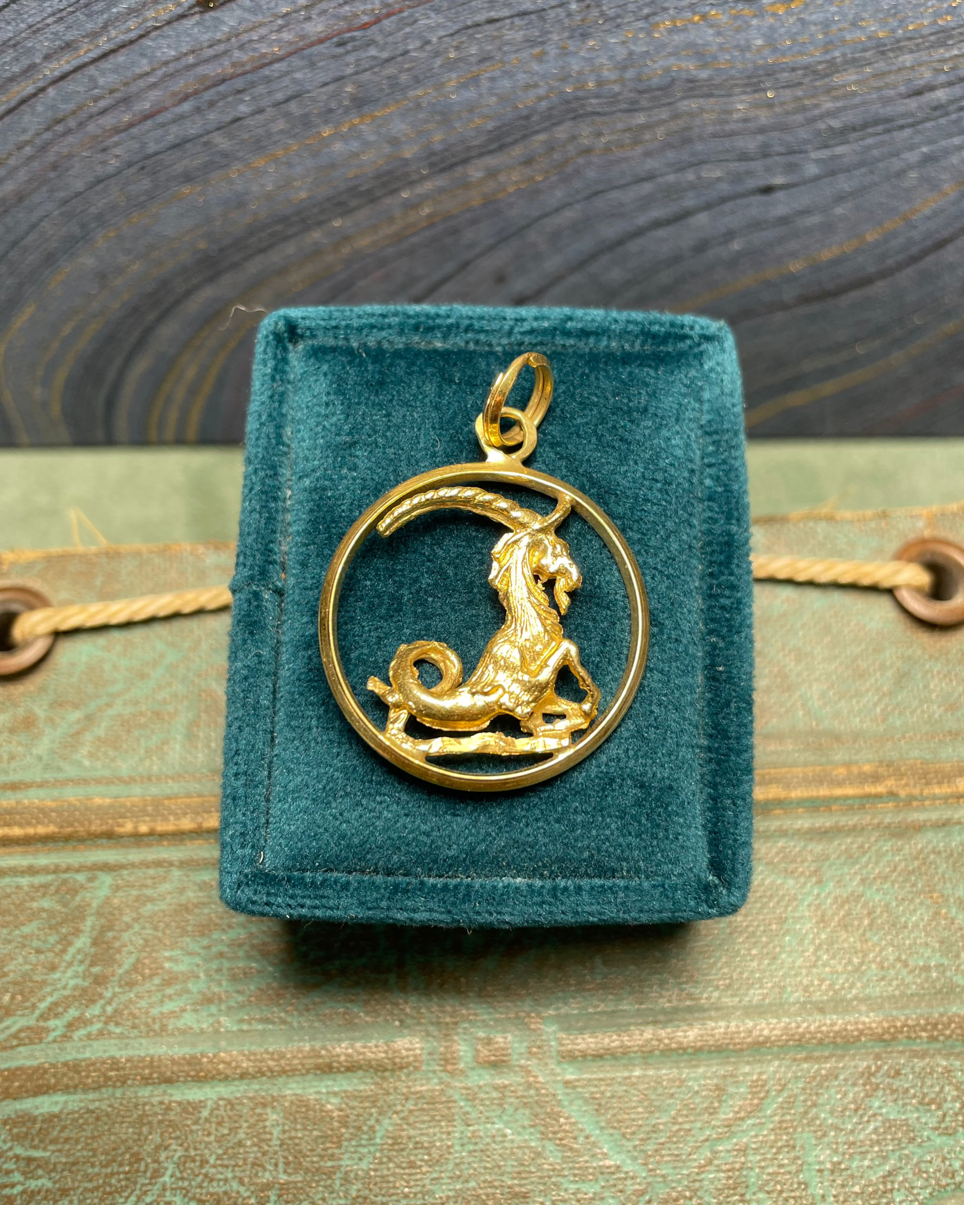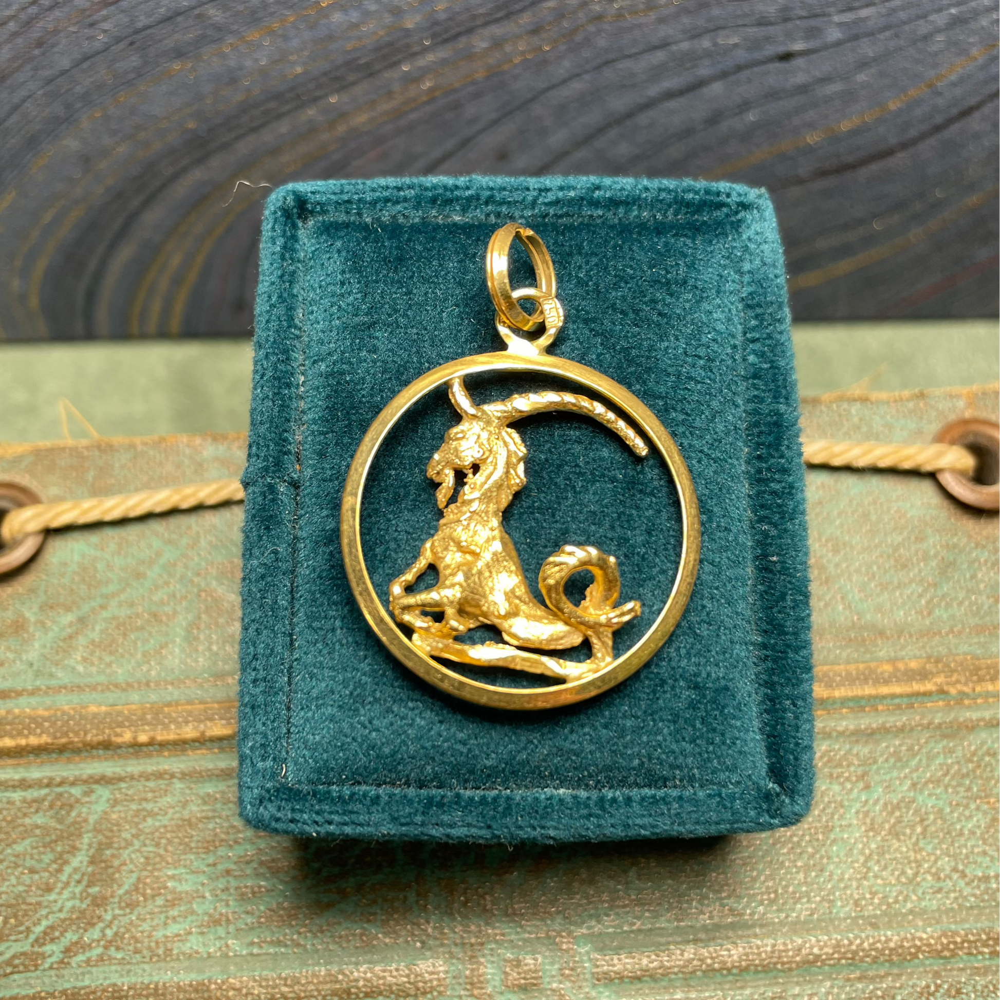 The most-est. Obsessed...big and beautiful. This 18k yellow gold 3D Capricorn encircled medallion is it! Very nice split ring bail. Length - 1 3/8" including bail. Bail opening - 6mm. Width - 1". 5.2g. XRF - 18k. Stamped - "750" "JDB?". Estate.