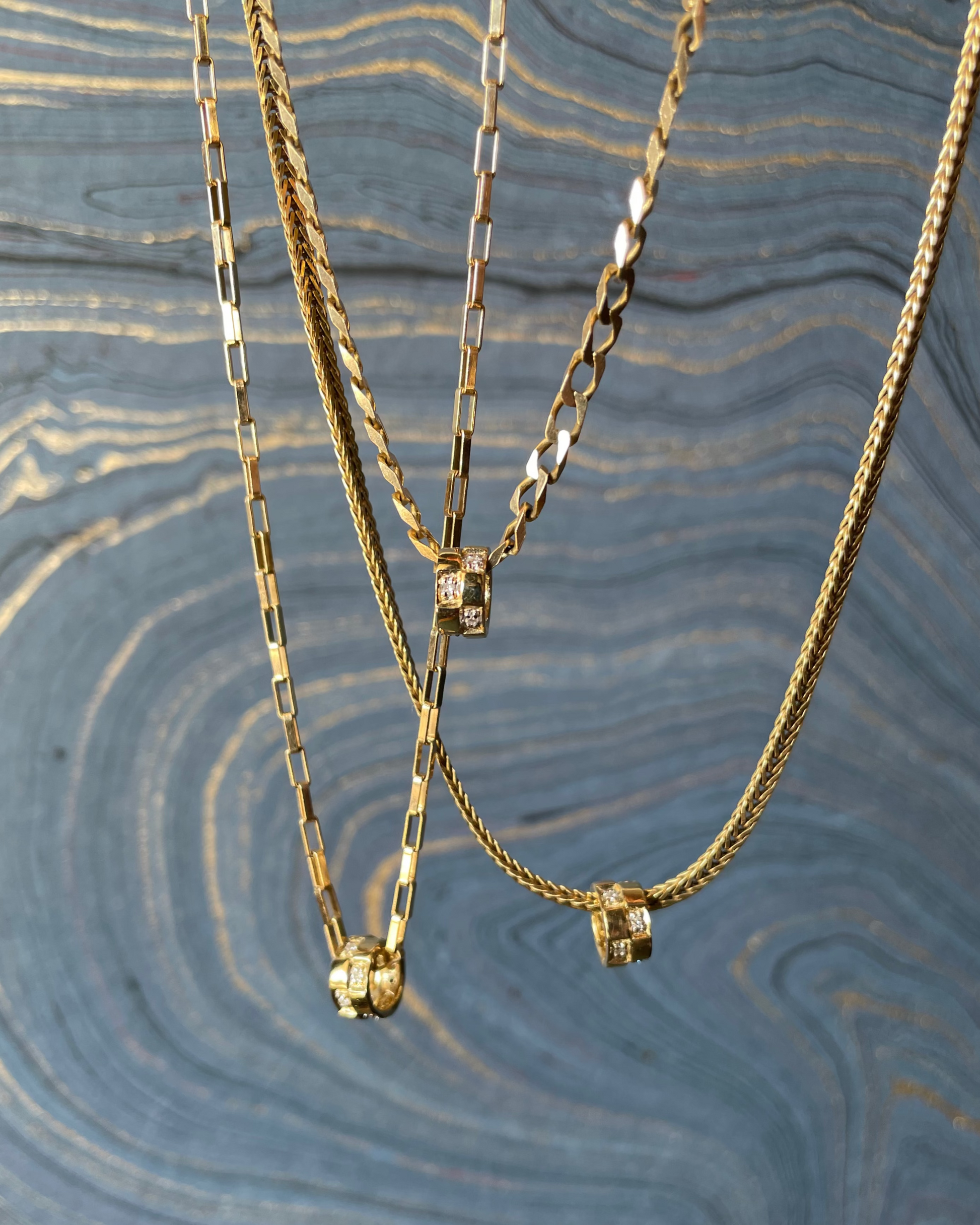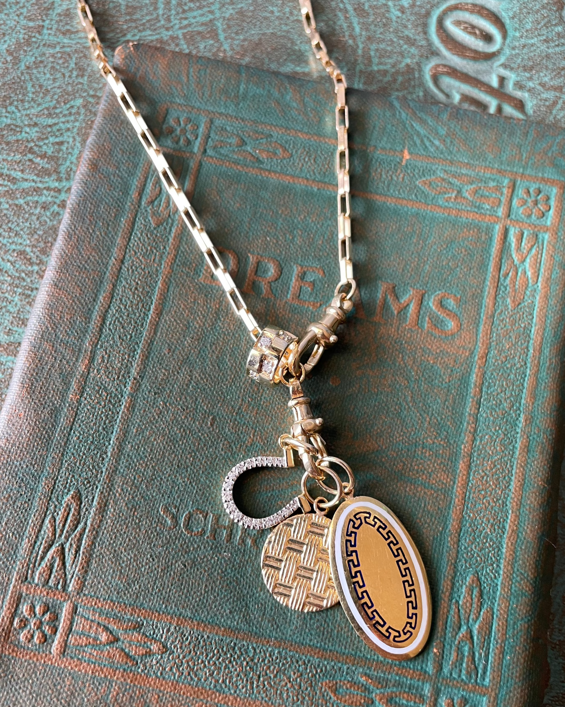 Love this 14k yellow gold and diamond checkboard spacer. Great as a charm spacer and big enough to look great on its own. Big opening that fits over all Double Dog Chains! Outer diameter - 8.1mm. Inner opening - 5.5mm. Width - 4.3mm. Approx - .94g.