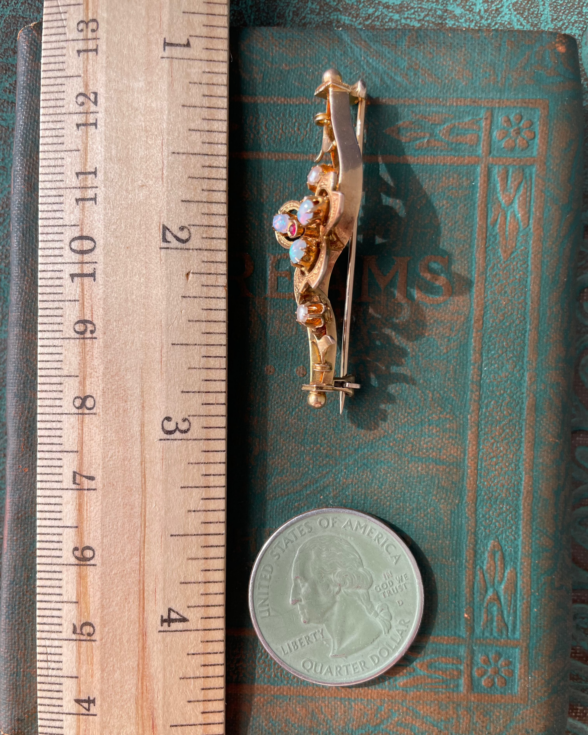 I stopped myself from converting this…but that’s what I would do. I’d take off the pin and add bail or actually 2, one on each end, so it could be worn like an extender or pendant. Such a pretty very vintage, if not antique 14k yellow gold brooch with opal 3 leaf clover with a garnet cab center and 2 of the cutest, but tiniest flowers with a pearl centers. Stones have not been evaluated by a gemologist, these are my unqualified presumptions!