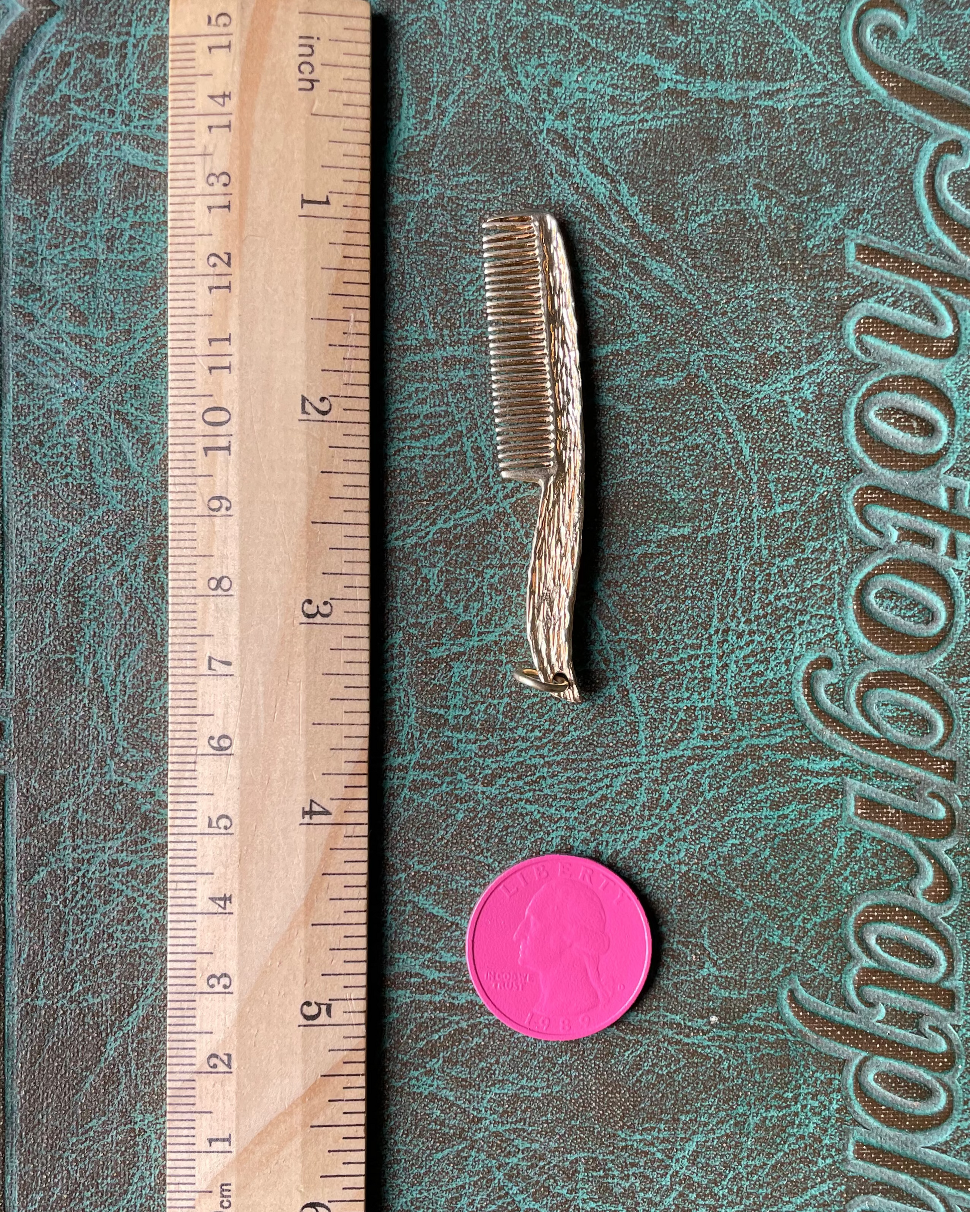 This is a big charm! Big enough to actually comb your hair or the hair of anyone or thing that will let you. 13k yellow gold comb charm with a great wood-ish texture. Length - 2 5/8" including bail. Bail opening - 4.5x3.4mm. 7.13g. Width - 1/2". XRF - 13.8k.