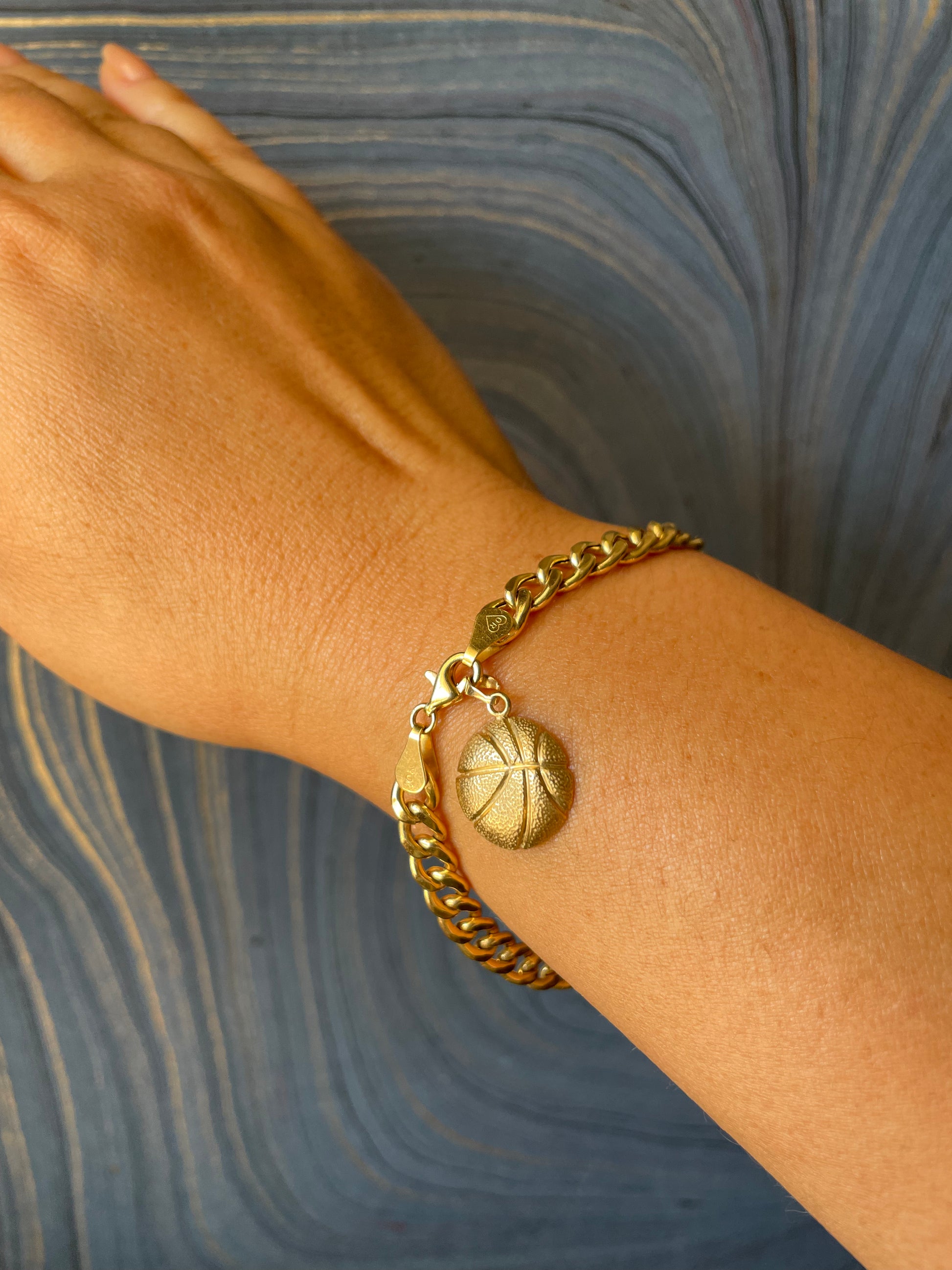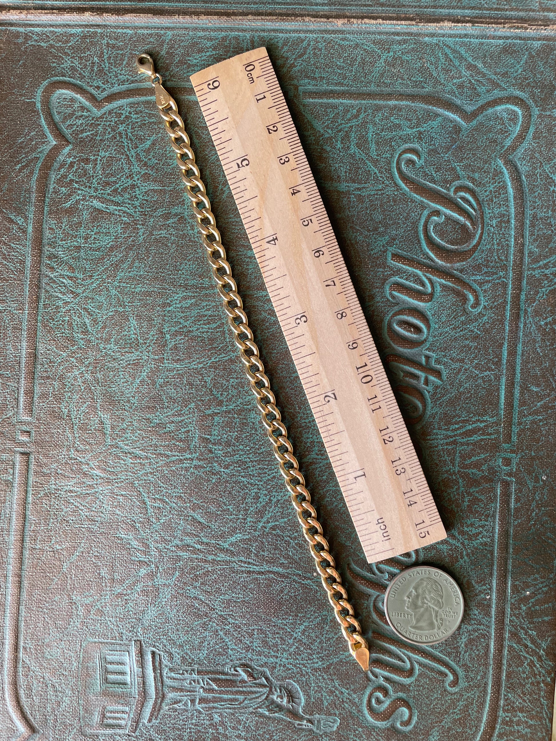 This 10k yellow gold rounded cut curb bracelet is hollow construction. Big look little price! Length<8". Recommended for 7.5" wrists and under. Width - 6mm. XRF-10.8k. 7.08g. Stamped "Italy 10k OR(inside heart)".