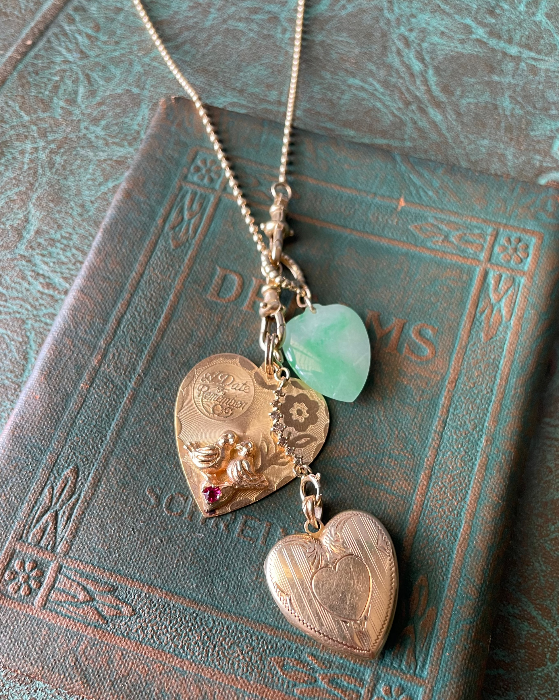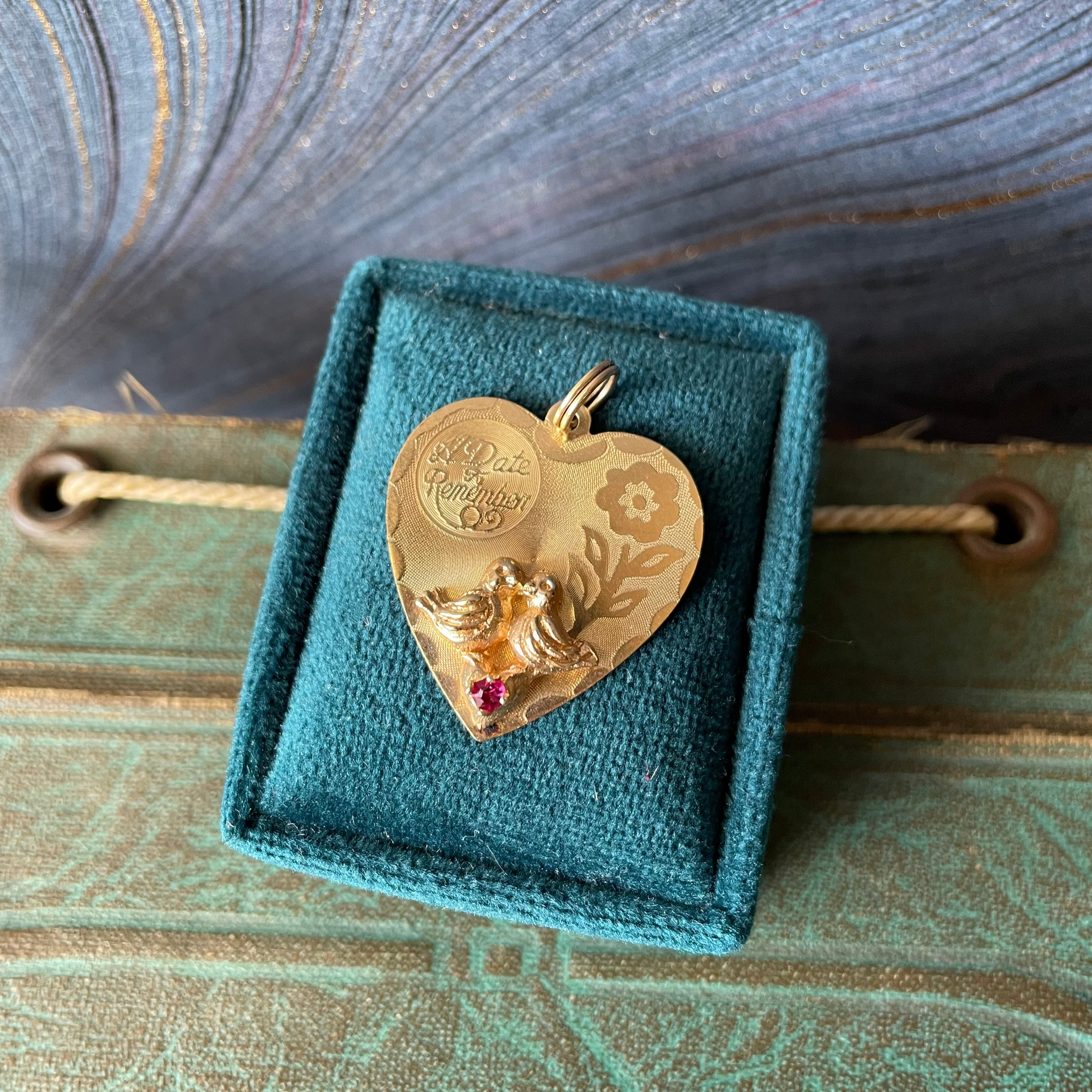 This 13k yellow gold "A Date to Remember" lovebirds charm is so sweet. Back engraving " Valerie & Stephen 8-29-65". Length - 1.25" including split ring bail. Bail opening - 4.9mm. Width - 1". 3.55g. XRF - 13.96k. Stone tests as glass.