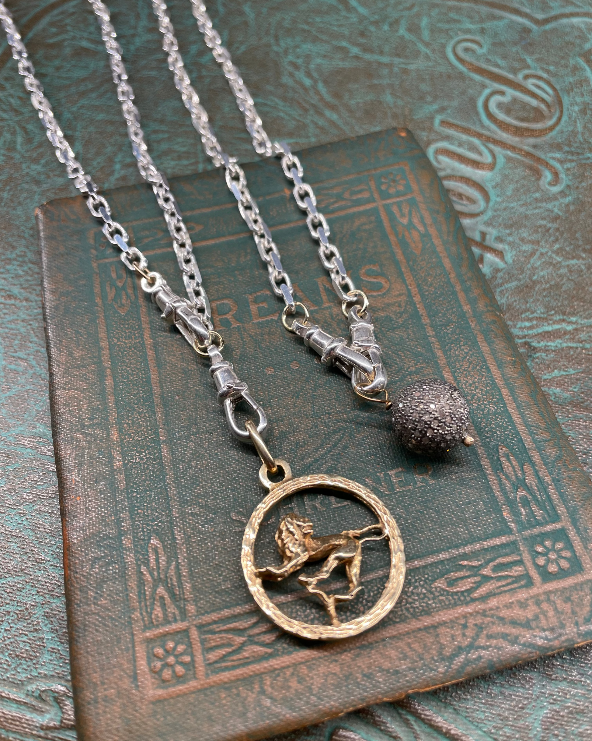 These are classic cut cable or biker chains in 3.2mm width, finished on each end with a 14k yellow gold jump ring and medium silver dog clip. Chains are Italian made 925 sterling silver. Medium dog clip arm - 1.1x2.3mm (charm bails must be larger than this to fit). New construction.
