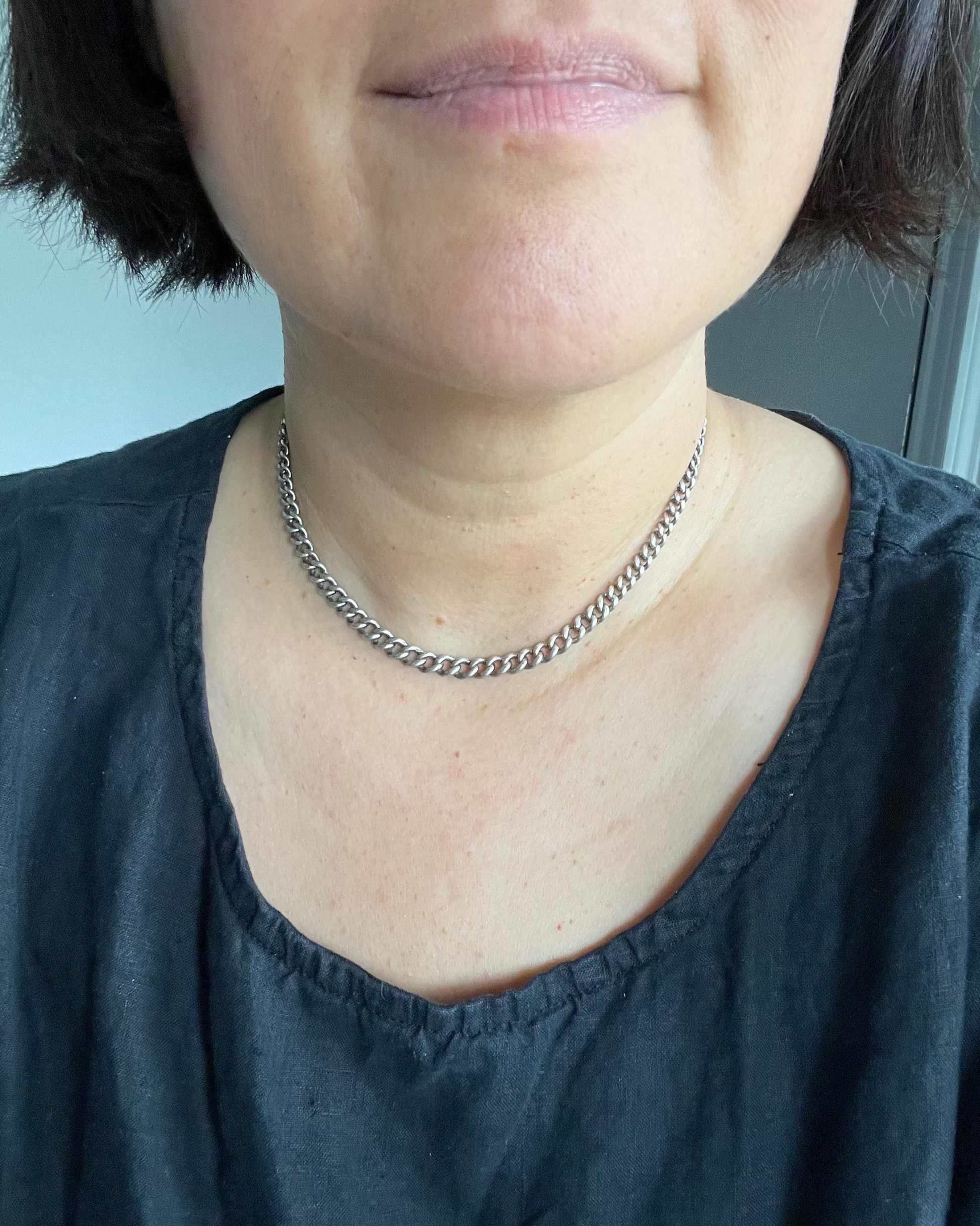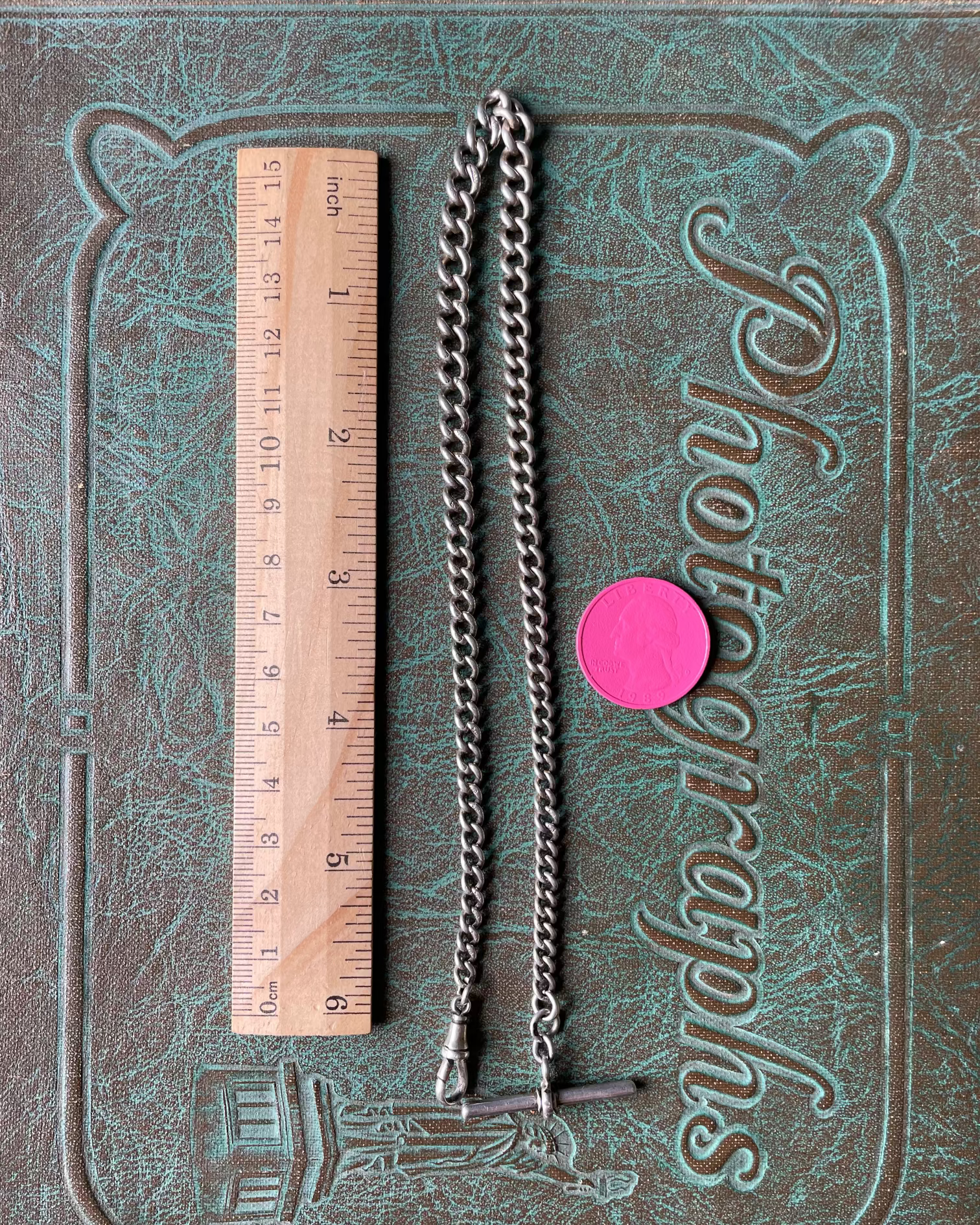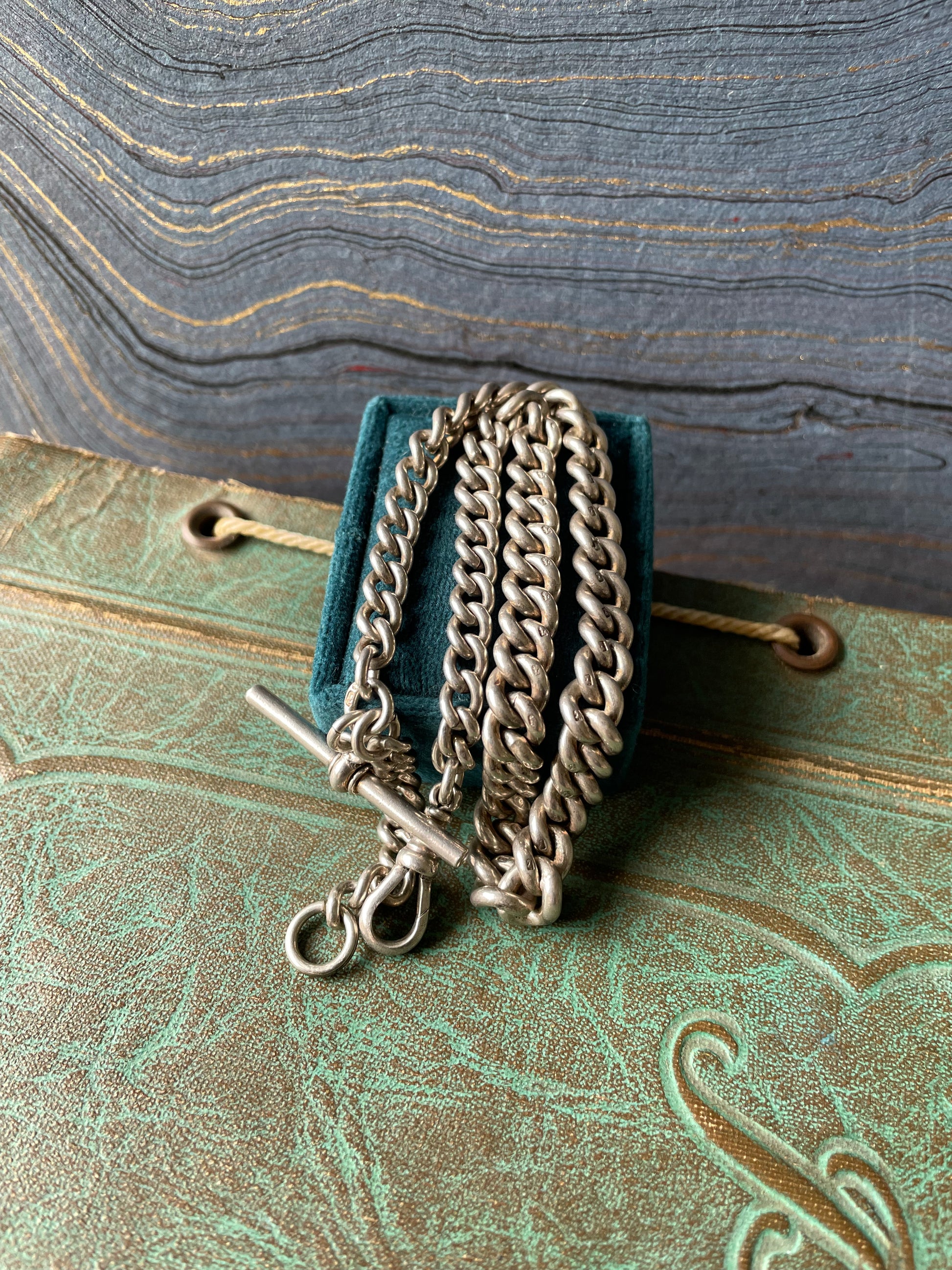 This classic English sterling silver graduated curb watch chain is hallmarked up the wazoo: the bar, the clip and every link, even one of the jump rings. Length - 14.5" (13.75" wearable). Width - 4.1 to 6.1mm. XRF - 92.5% silver. 22.8g. Stamped -T-Bar: (lion, old English b? in square, & illegible maker maybe G.E.G.) Links: all have English lion. Jump ring: (anchor for Birmingham) (b for 1901). Dog clip: "G. E."