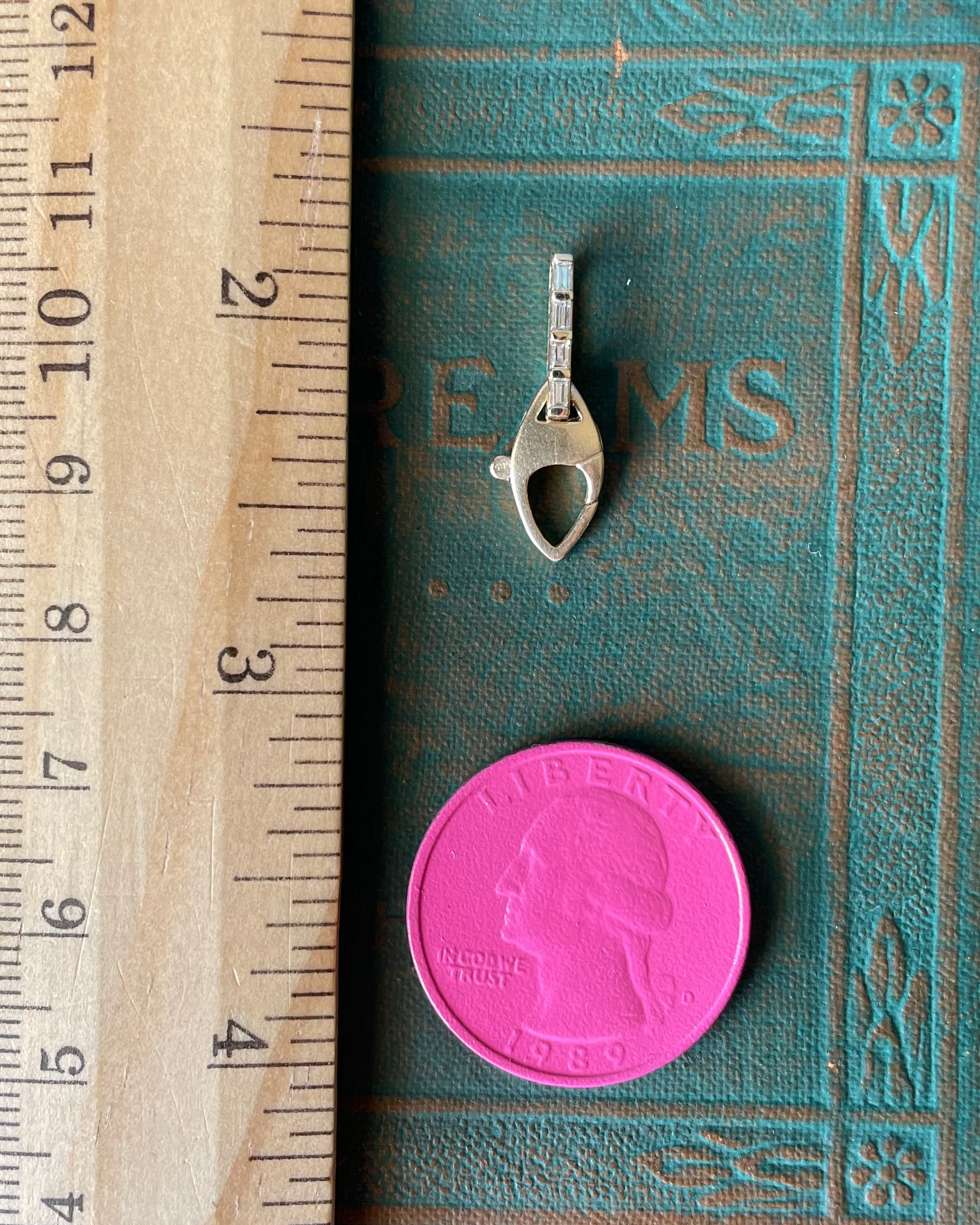 The diamond lovers deserve some Mod Lob, too! This bail features 4 natural diamond baguettes set into a 14k yellow gold paperclip style bail. Length - 13/16" including bail. Bail opening - 6.7x1.7mm. Width - 5/16". 1.27g. New construction.
