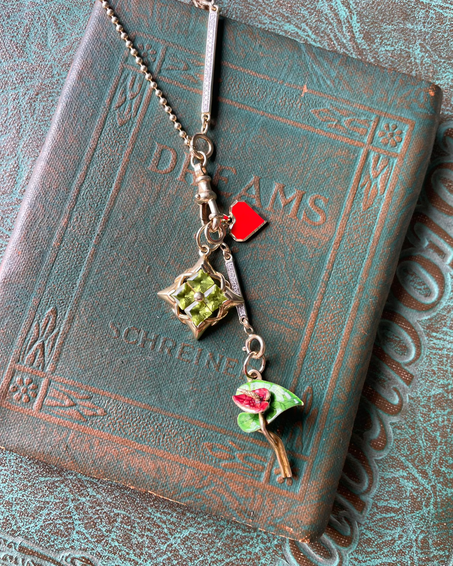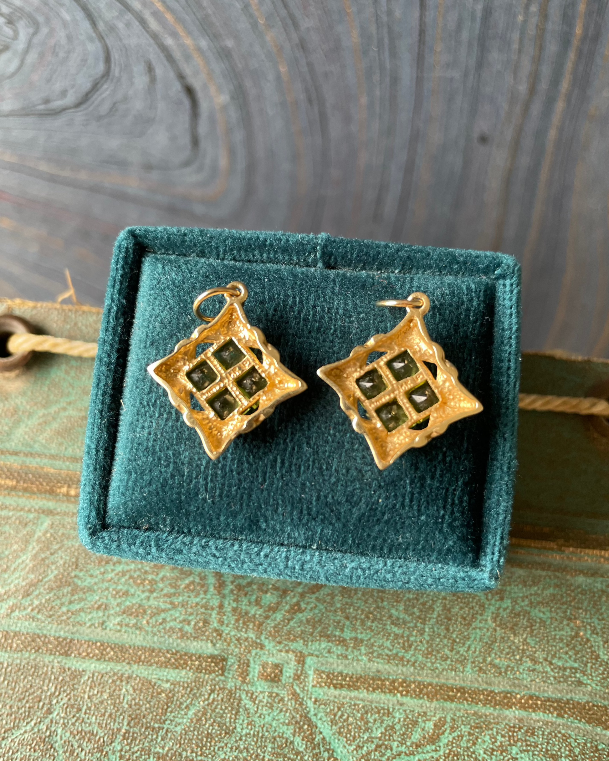 Earrings, brooches....I love to take them apart! These 2 were earrings, but I think even cuter as charms. 13k yellow gold with sorta invisible set princess cut peridots creating the green center of a star. Length - 15/16" including bail. Bail opening - 4.5mm. Width<3/4". 1.82-2g. XRF - 13.8k. Tests and gemstone, not glass, but has not been evaluated by a gemologist.