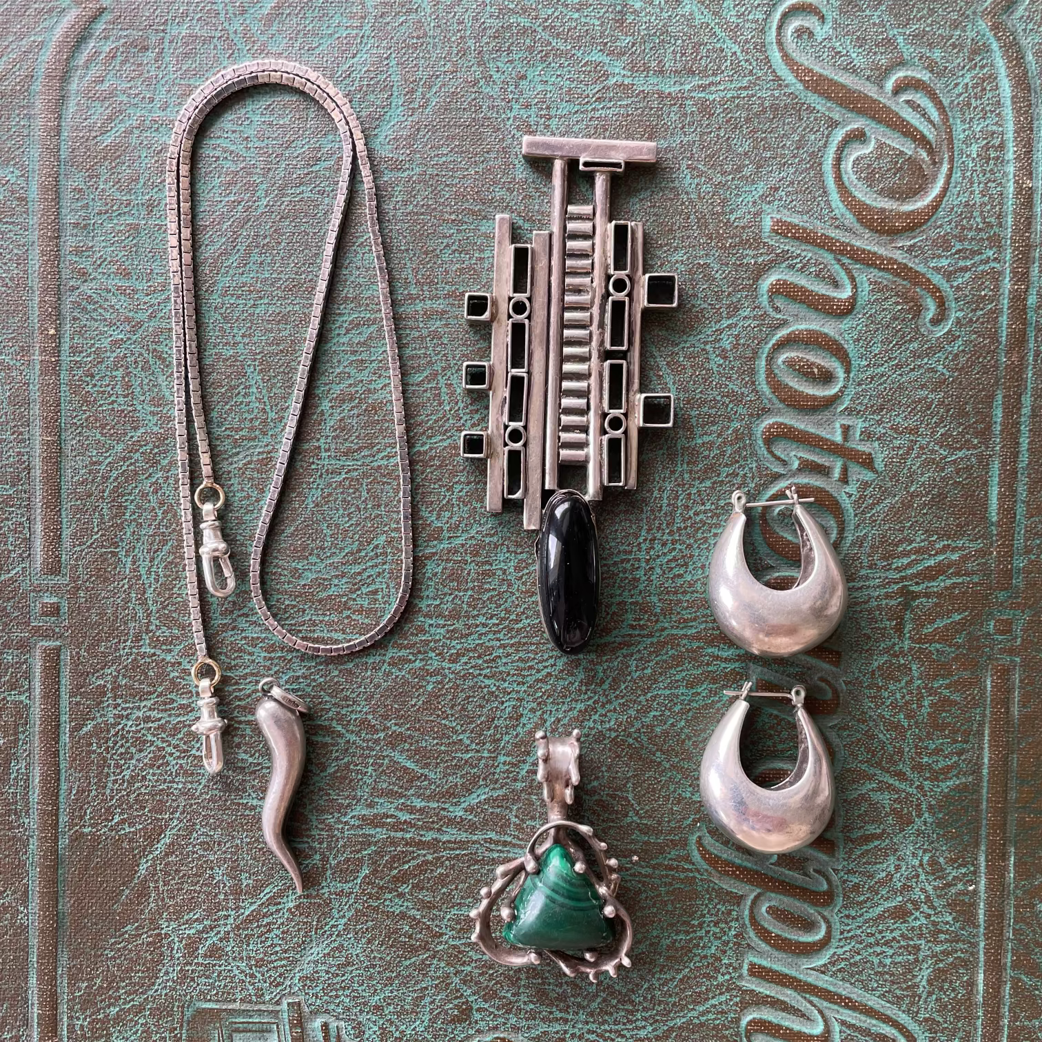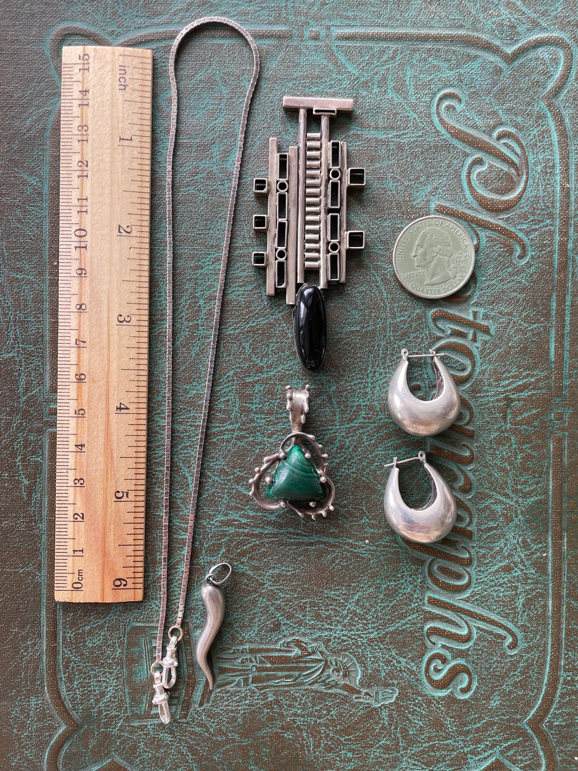 Artist made sterling and onyx geometric pendant. Length > 3" Width - 1 1/4" 18.34g. Signed - "Aaron Rubinstein sterling b.Onyx 8/8/93". Please note "bail" is very small 2mm x 2mm square tube. If you would like to put this on a permanent chain please reach out.