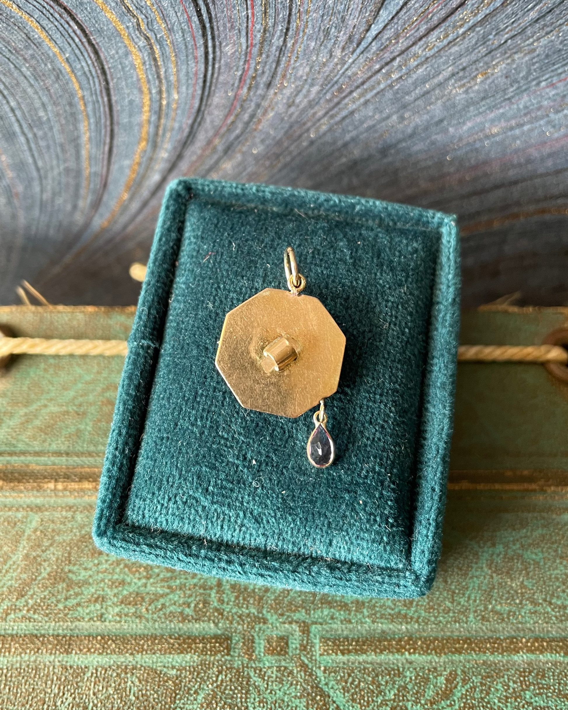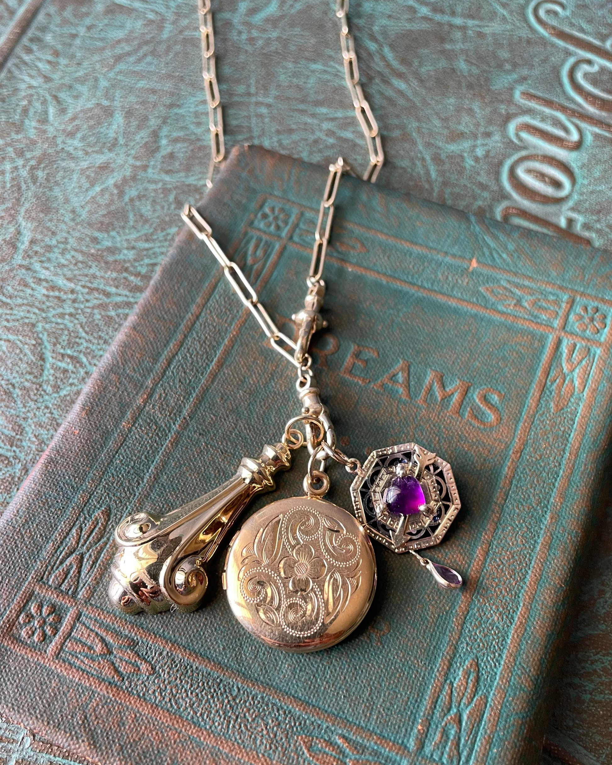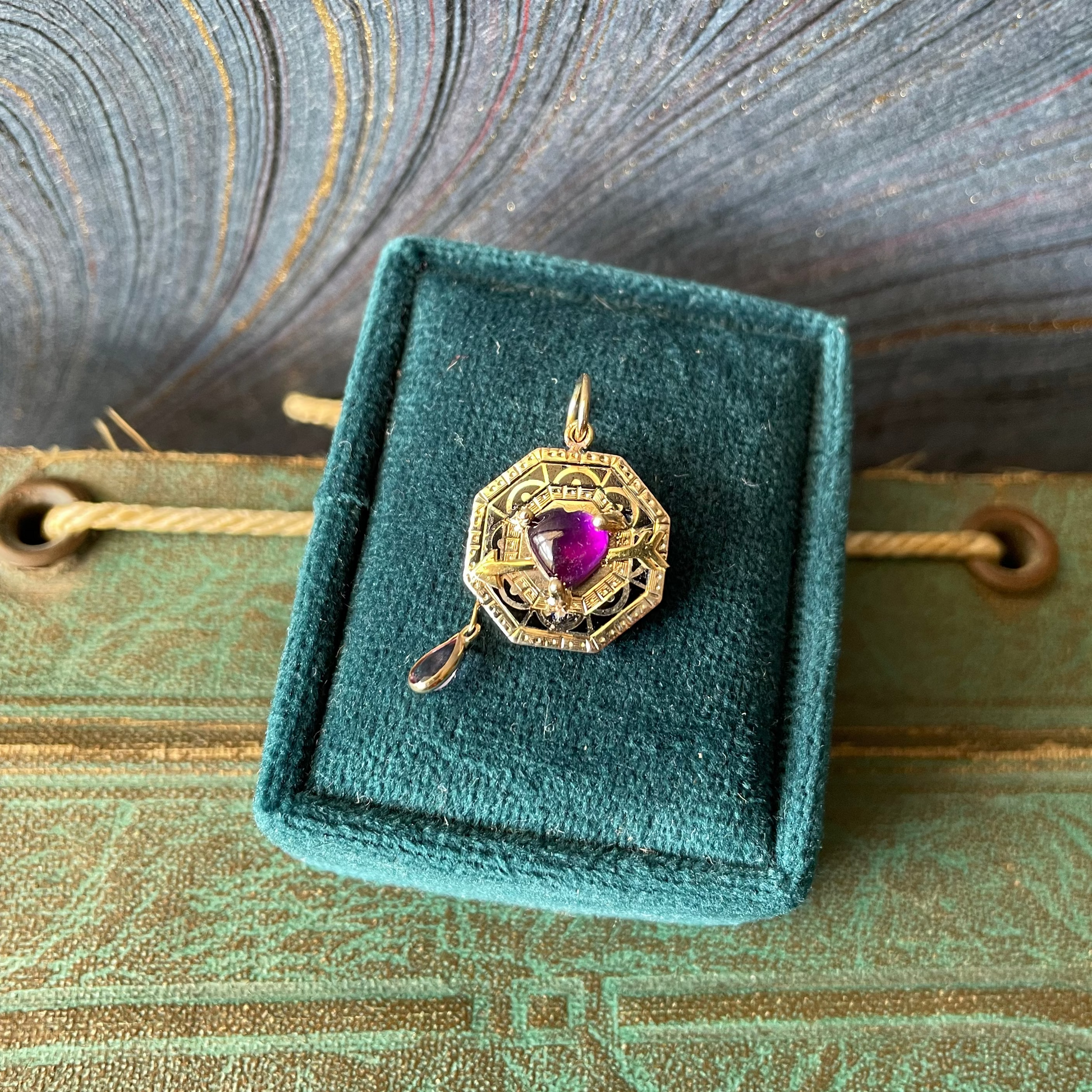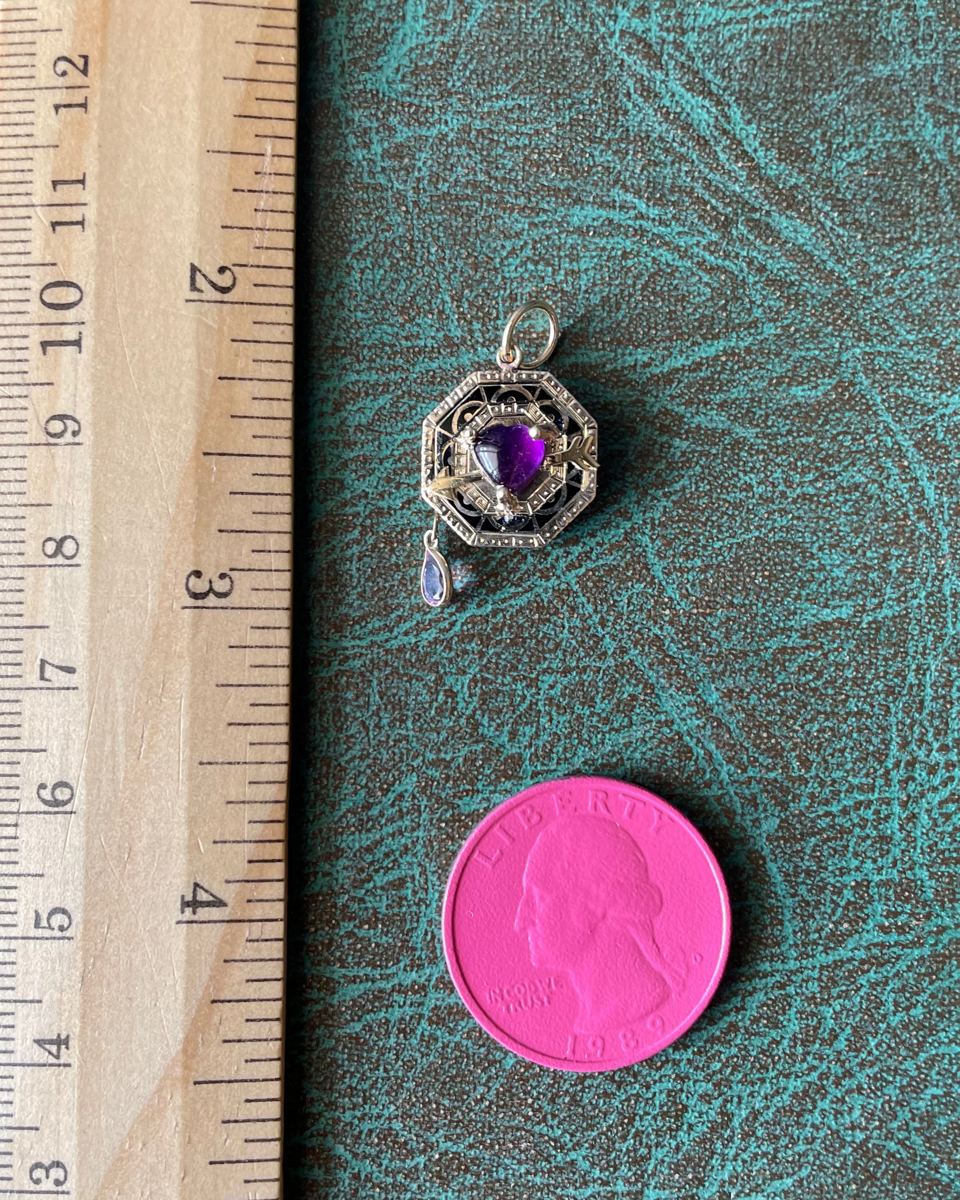 This is my 3rd round of Shot thru the Heart charms and changed it up with an amethyst heart and drop. Backing is a 10k and black enamel cufflink, all other portions are done in 14k. Length - 7/8" including bail. Bail opening - 4.5mm. Width -5/8". 1.55g.