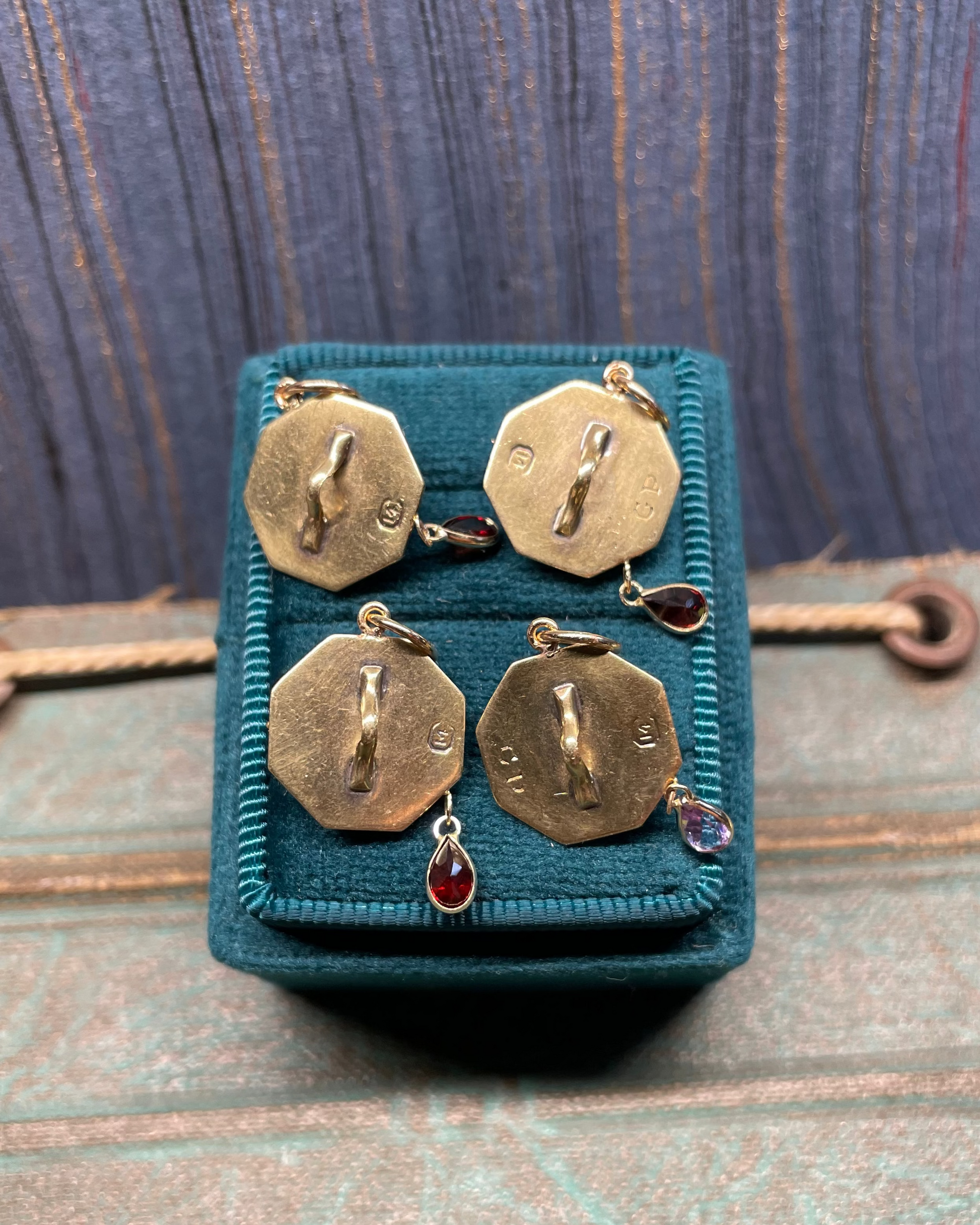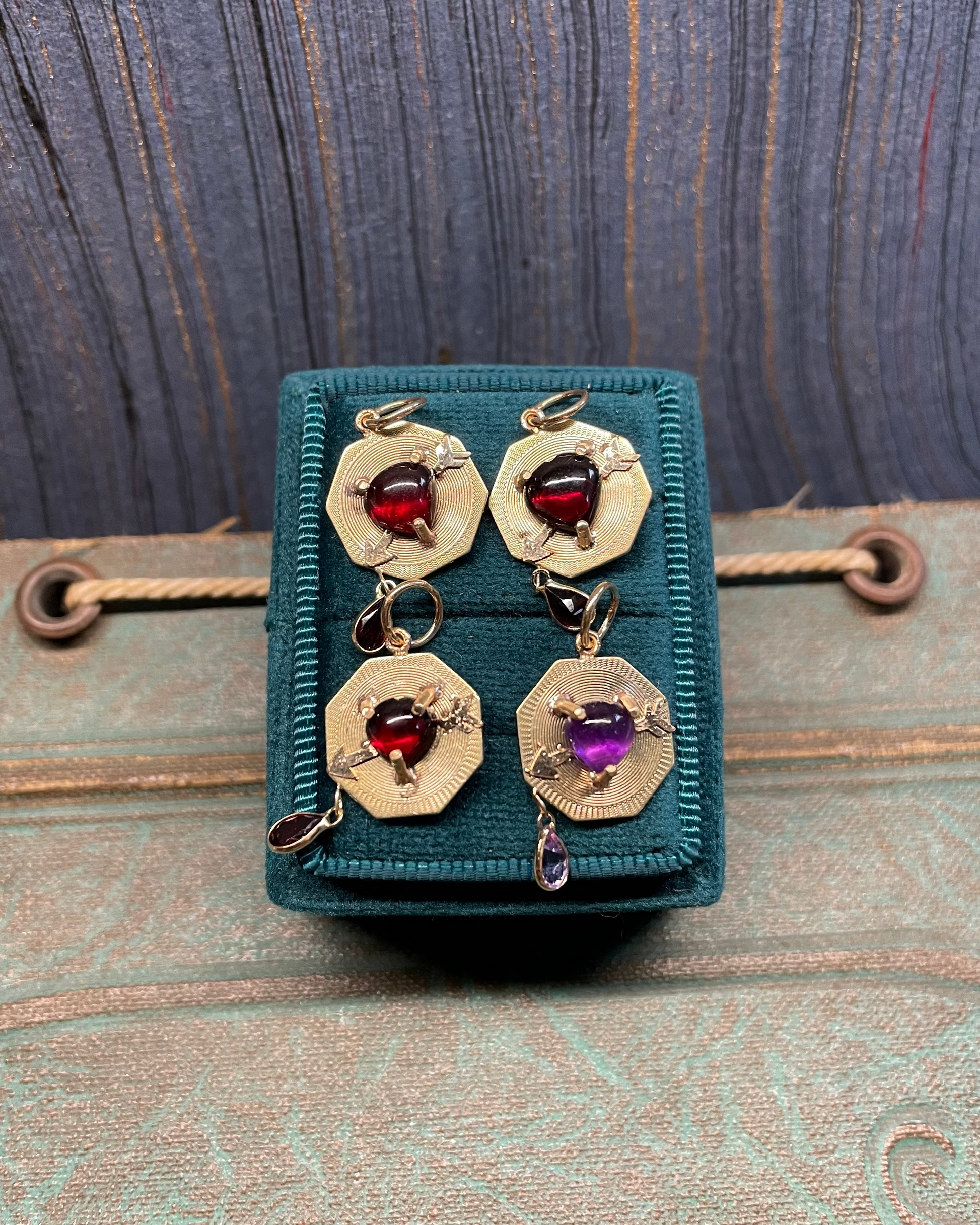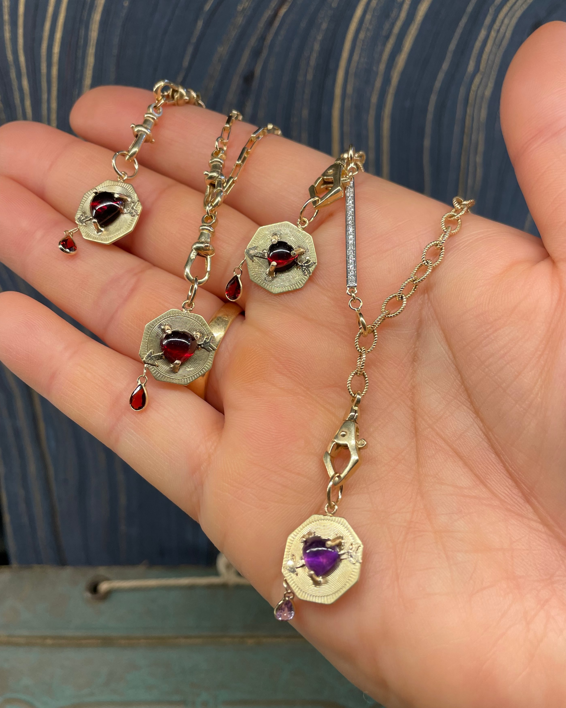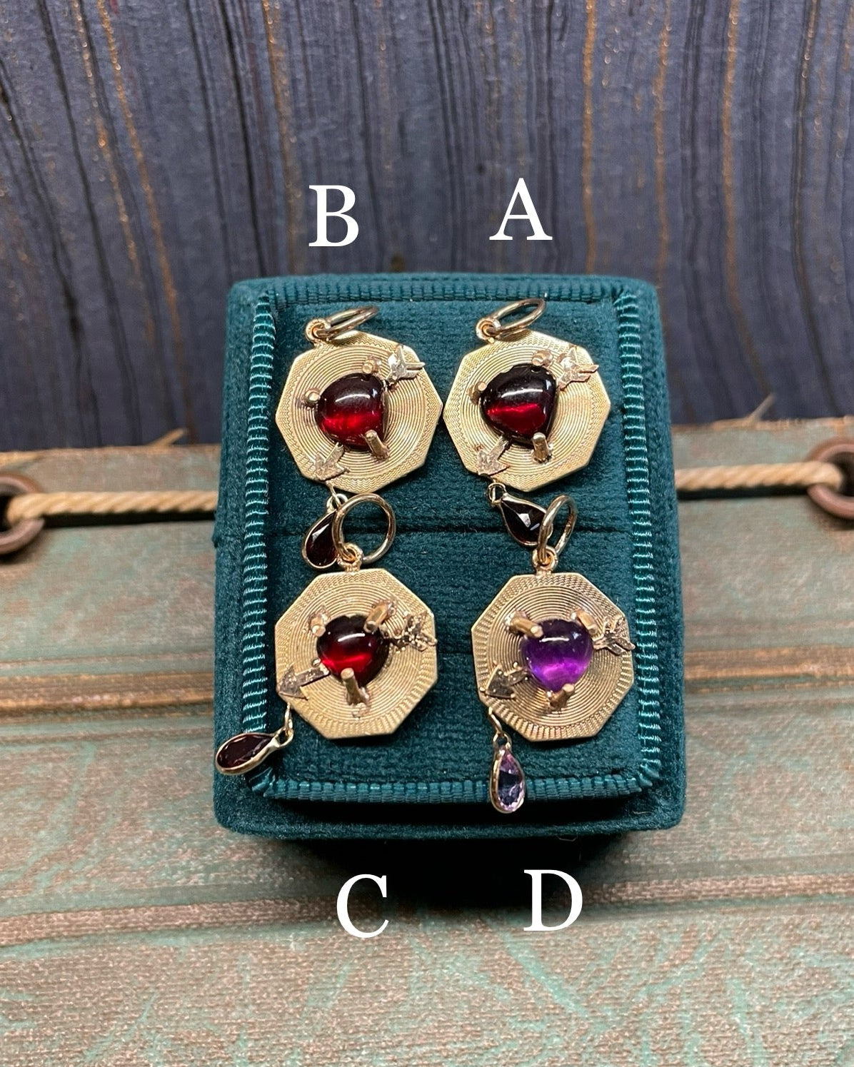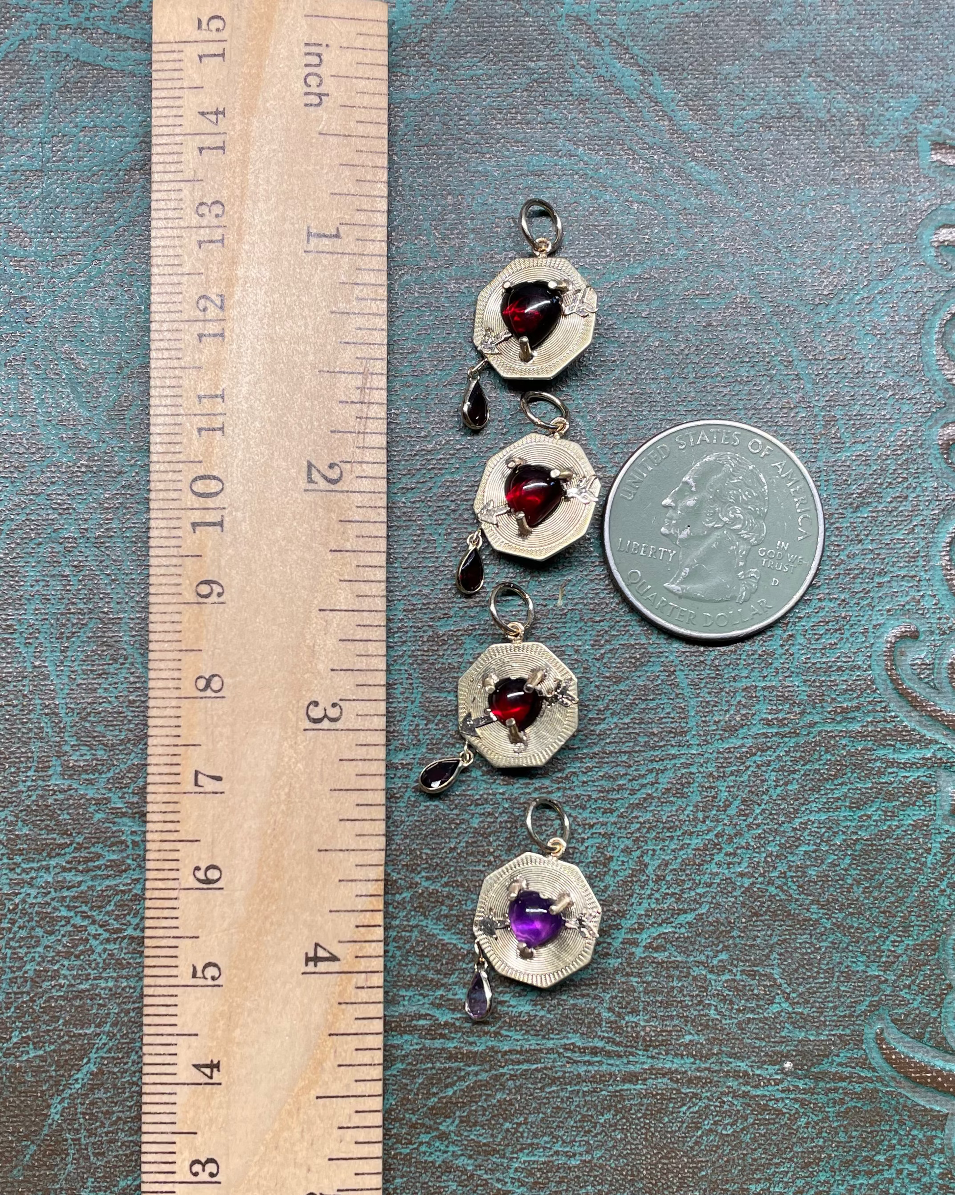This is fourth round of Shot Thru the Heart Charms. These are 14k yellow gold cufflink conversions with 14k bails, arrows & prongs. A, B & C are garnet cabochon hearts, garnet drop. D is amethyst cabochon heart and drop. Length - 1" including drop/bail. Width >1/2". A: 2.15g / B: 2.2g / C: 2g / D:1.87g. Bail opening - 4.3mm.