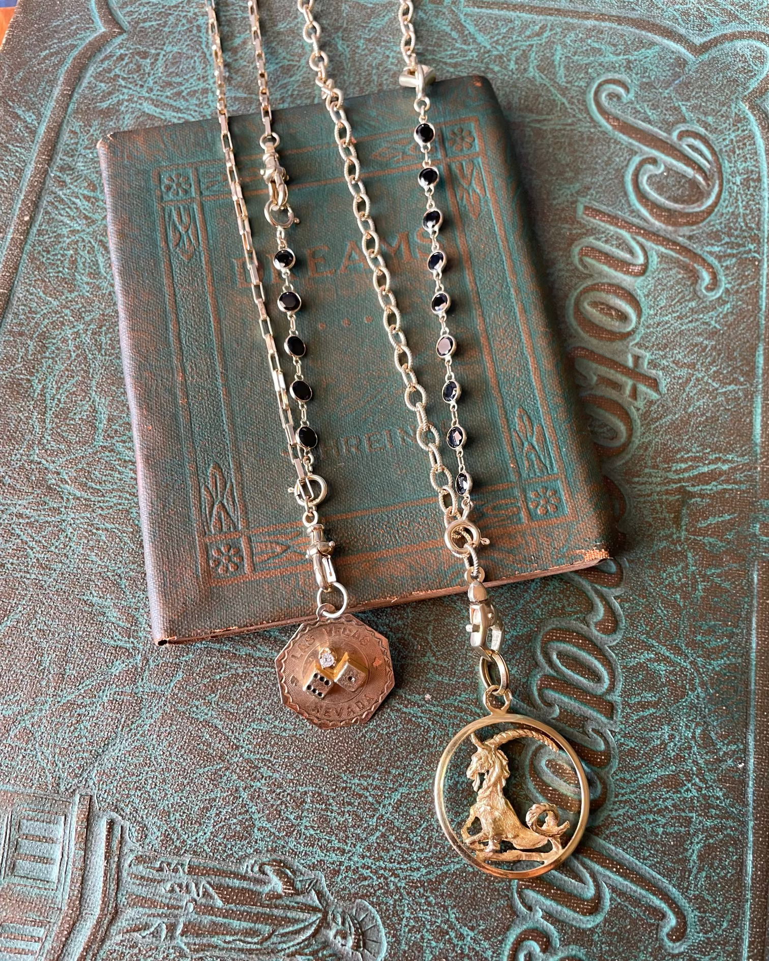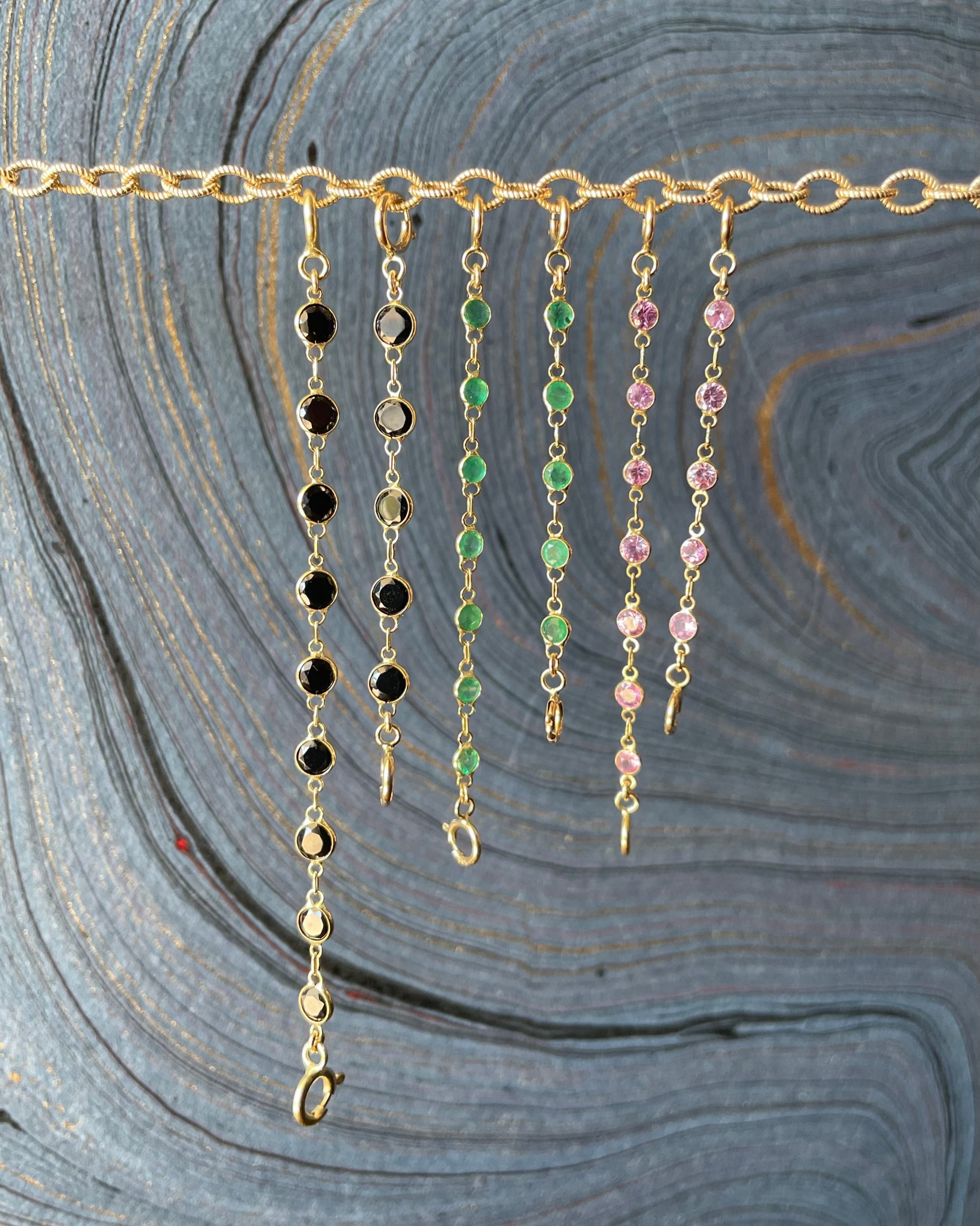 This 14k yellow gold and black spinel Stringy is a larger size (4.2mm) than the emerald and pink sapphire (3mm) versions. Bringing a bolder graphic option to connect, drop and extend within your stack. Also featuring slightly larger 14k yellow gold spring rings with inner opening of 3.4mm. These bezel set round cut spinels can be worn either flat side or pointy side out.