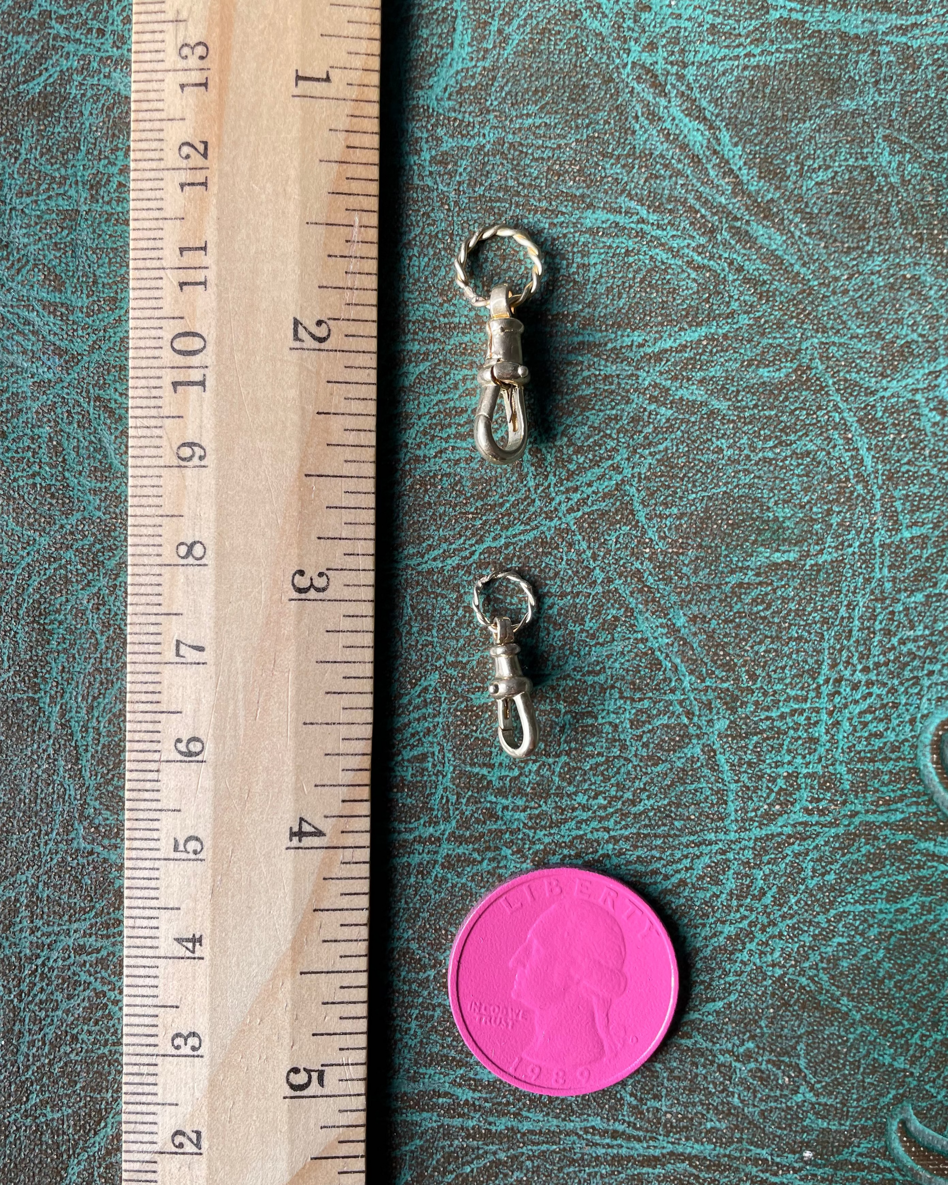 Medium measures 1" tall including the bail. Bail opening is 6.9mm. Inner opening of dog clip 6.64 x 3.55mm. Width of dog clip arm 2.15mm. New construction.