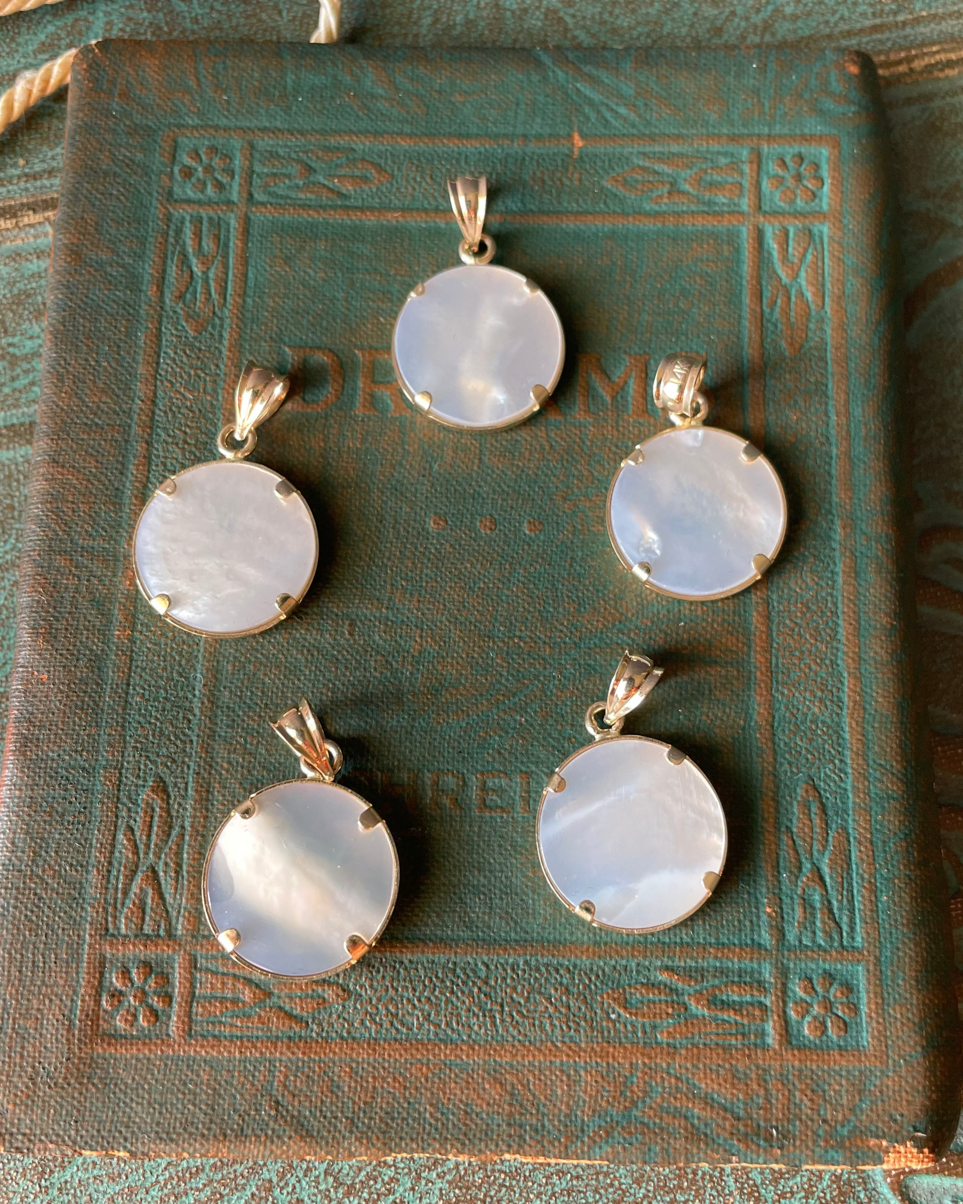 These astrological signs have been carved out of luminous mother of pearl. They come standard in a plain 14k yellow gold round frame. These are a natural material and will have natural variation.